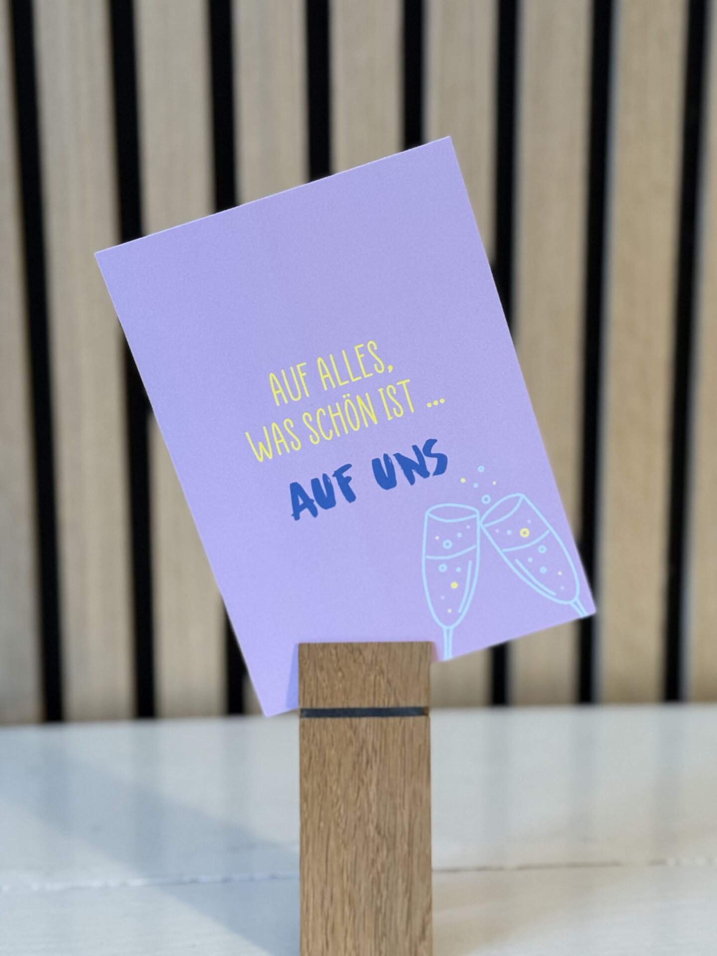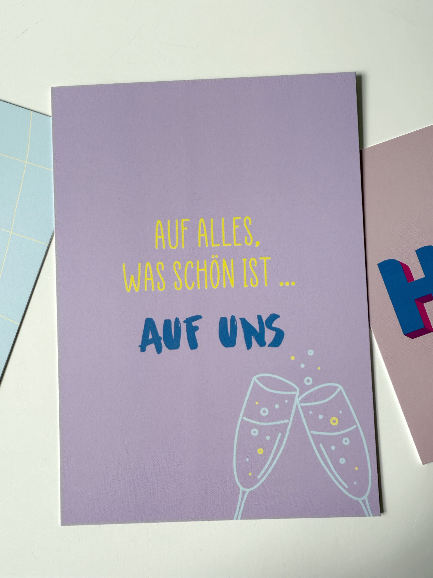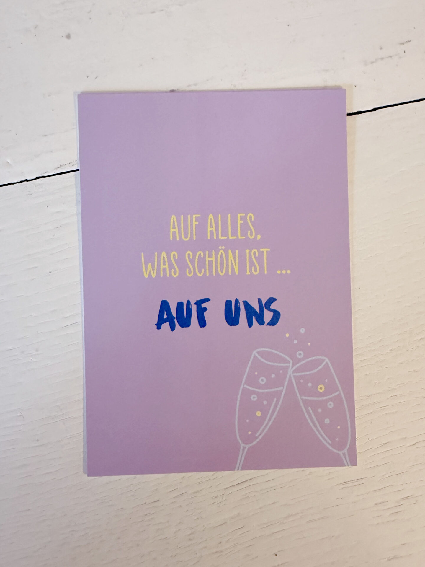 Liebevoll gestaltete Postkarte in flieder mit der Aufschrift „auf alles was schön ist … auf uns“ in gelb und blau mit anstoßenden Gläsern in der unteren Ecke.