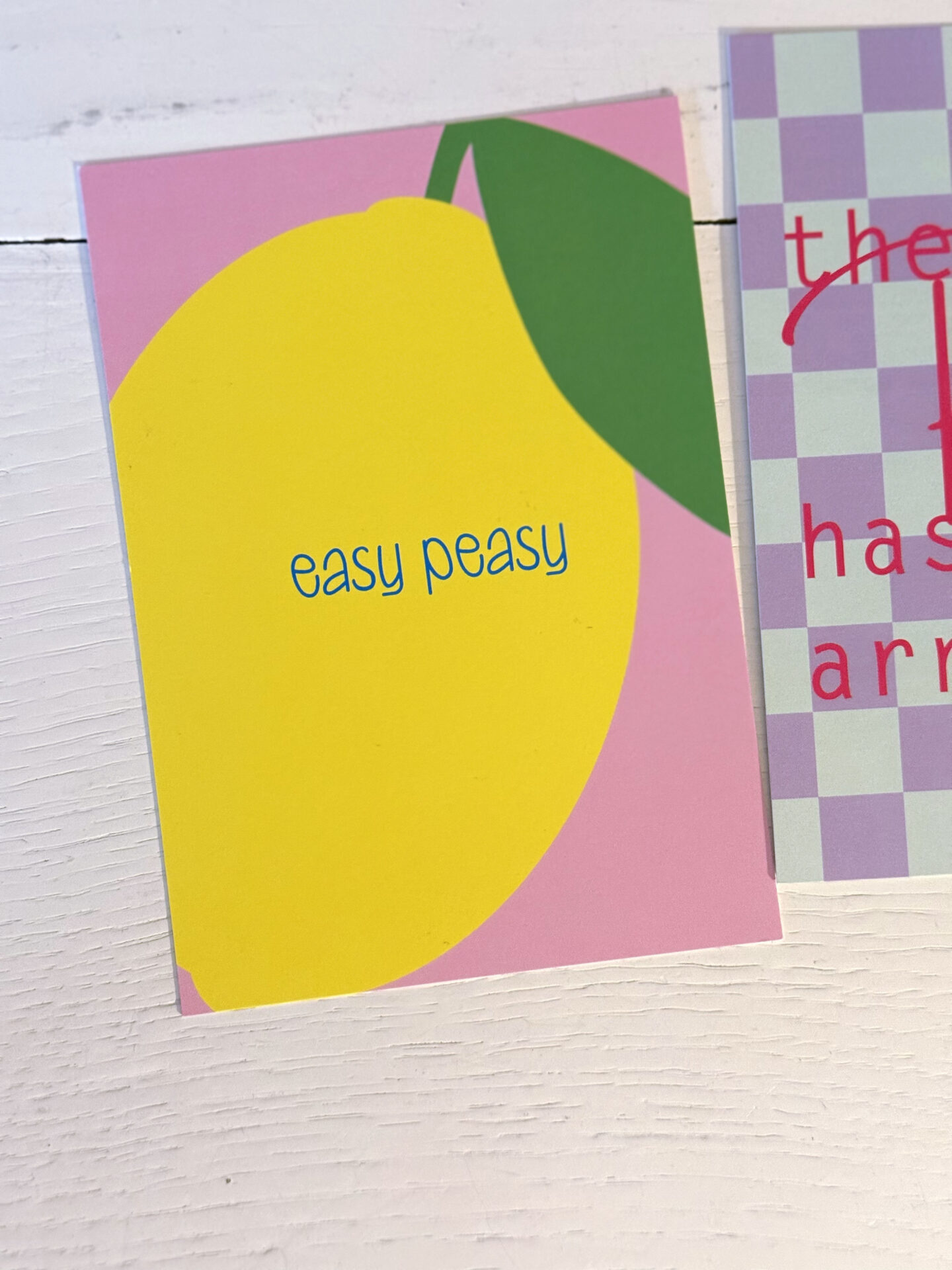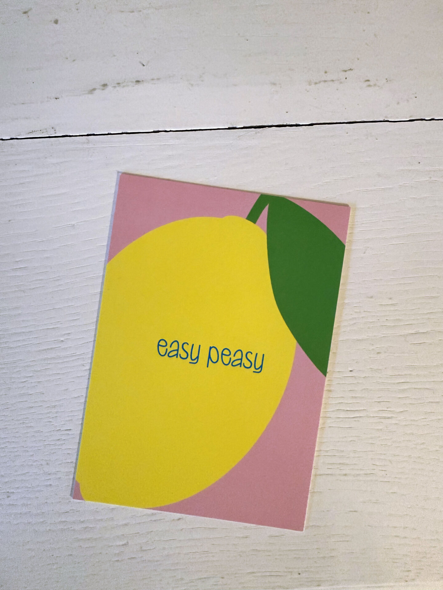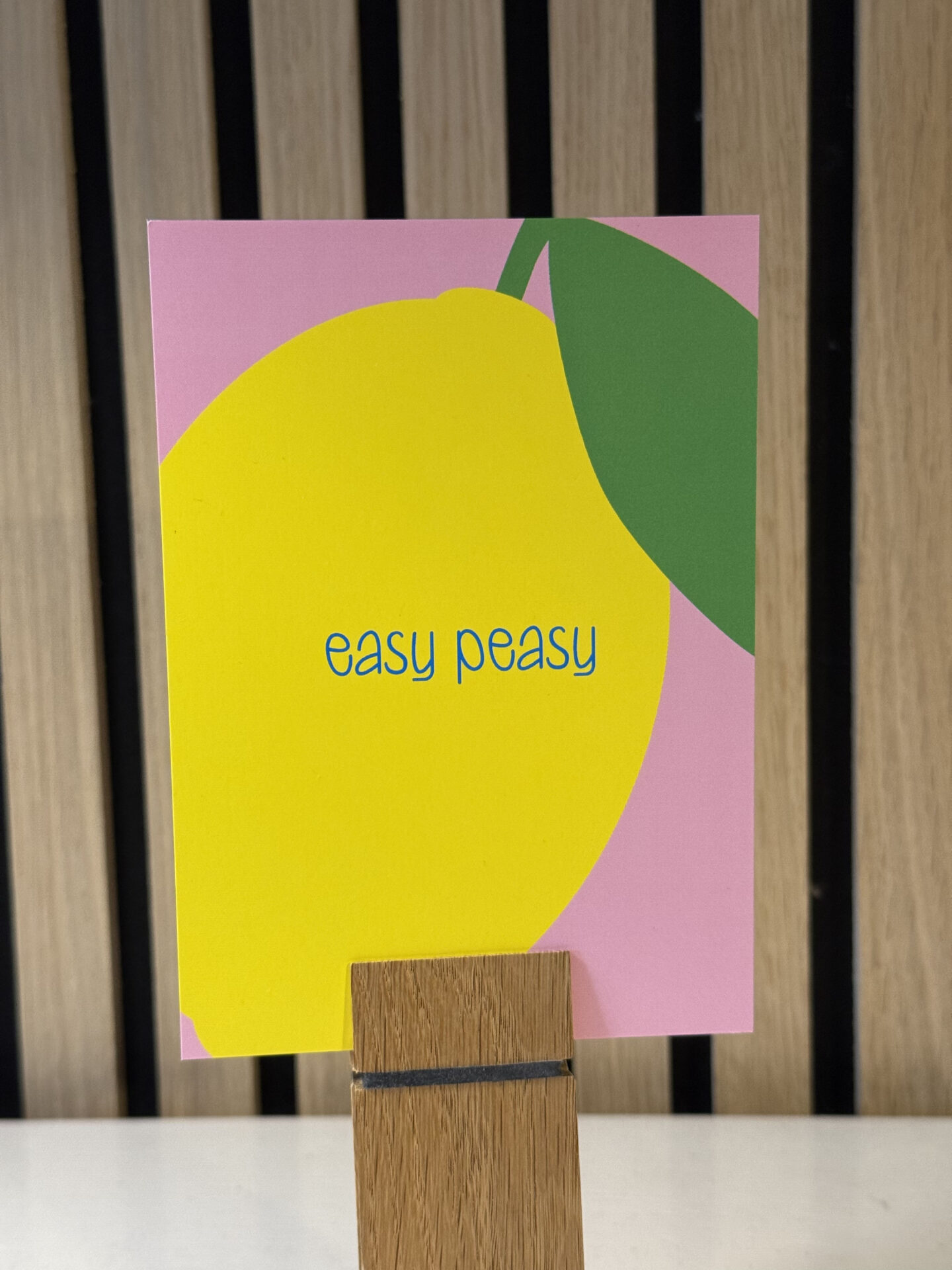 Liebevoll gestaltete Postkarte in rosa mit einer angedeuteten Zitrone mit der Aufschrift „easy peasy“.