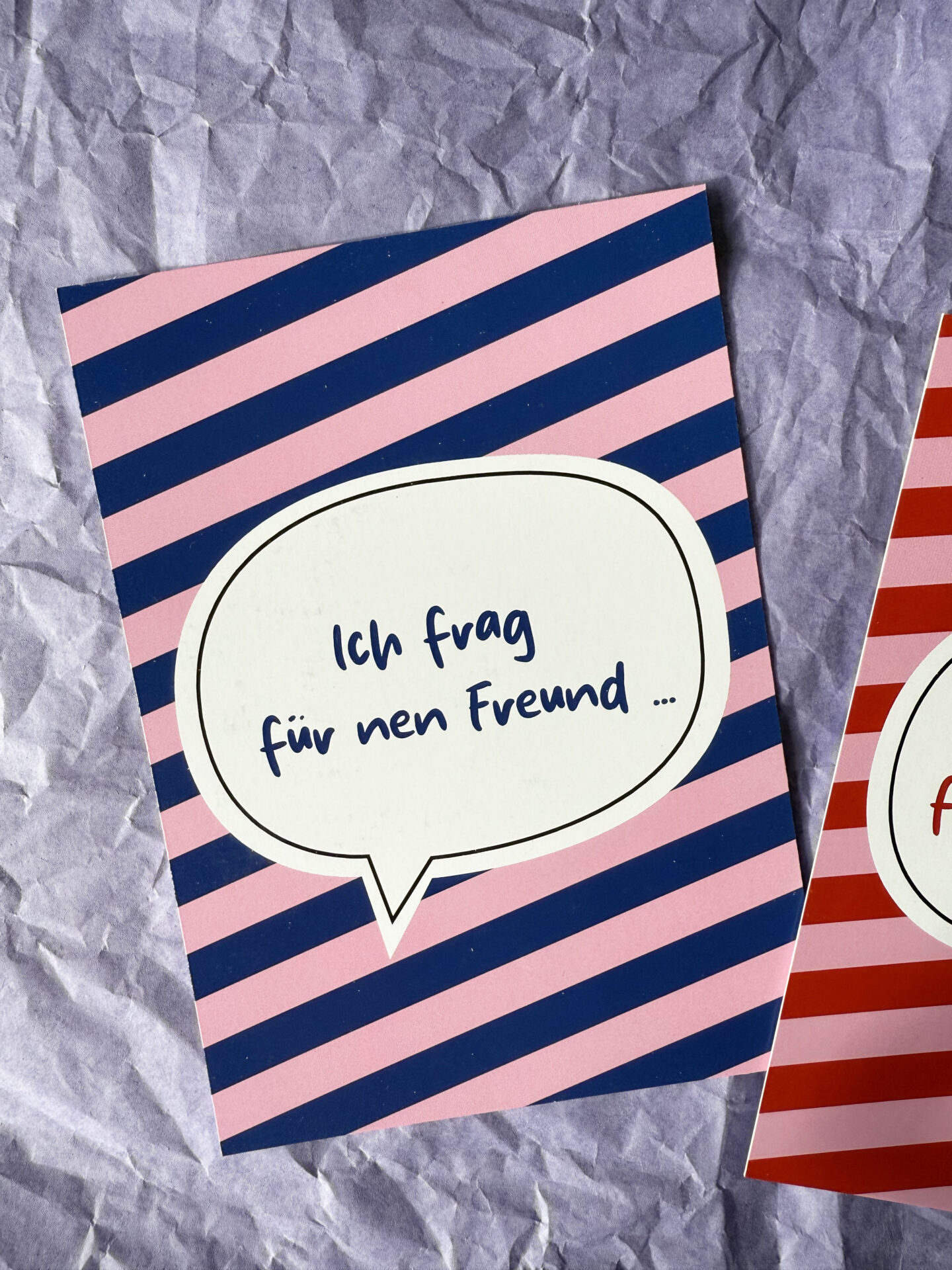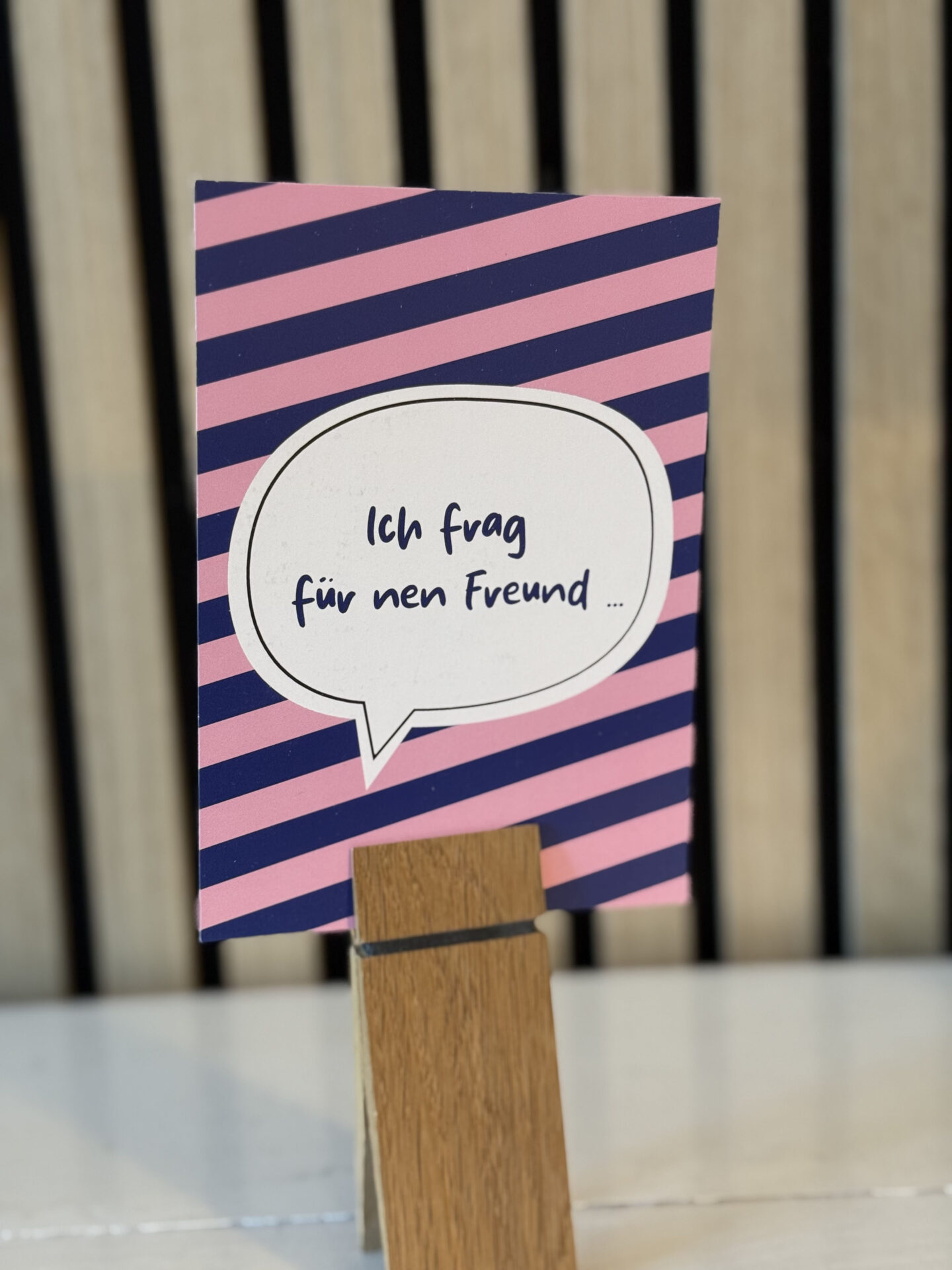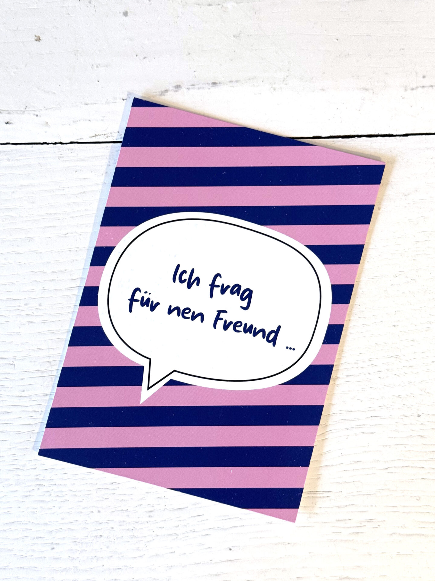 Liebevoll gestaltete Postkarte, gestreift in blau und rosa mit einer Sprechblase und der Aufschrift „Ich frag für nen Freund …“ in blau.