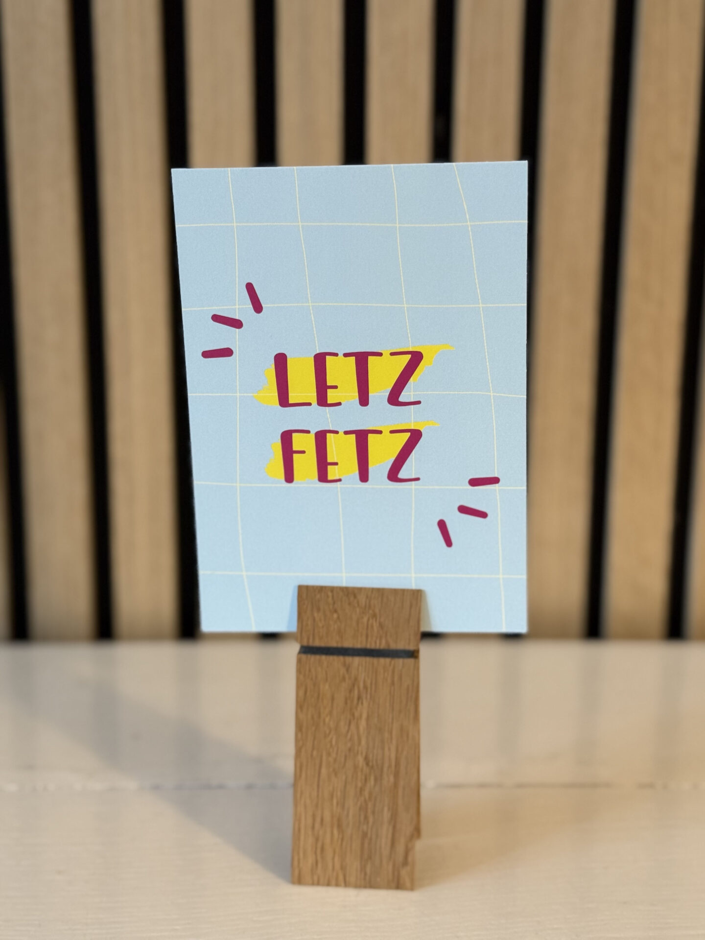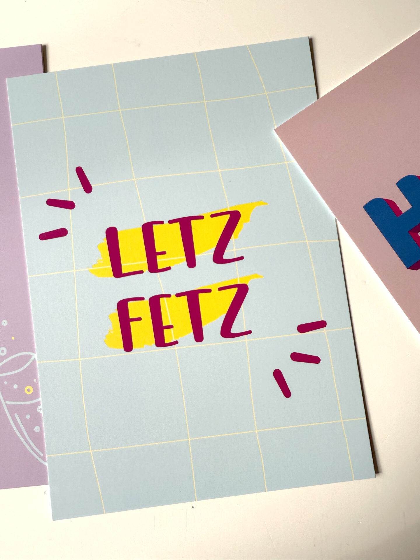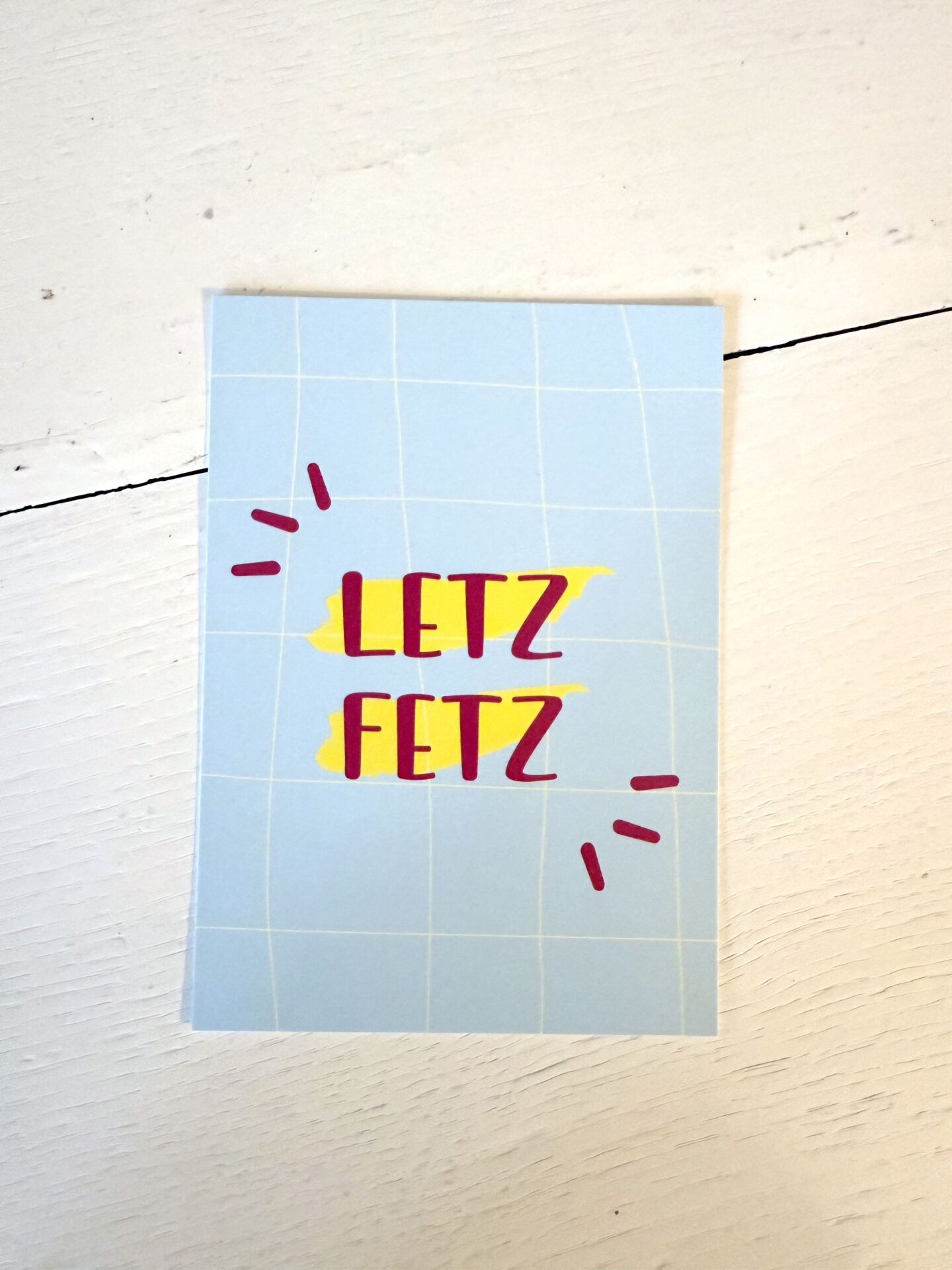 Liebevoll gestaltete Postkarte in hellblau, leicht kariert mit gelb mit der Aufschrift „LETZ FETZ“ in bordeaux und gelb.