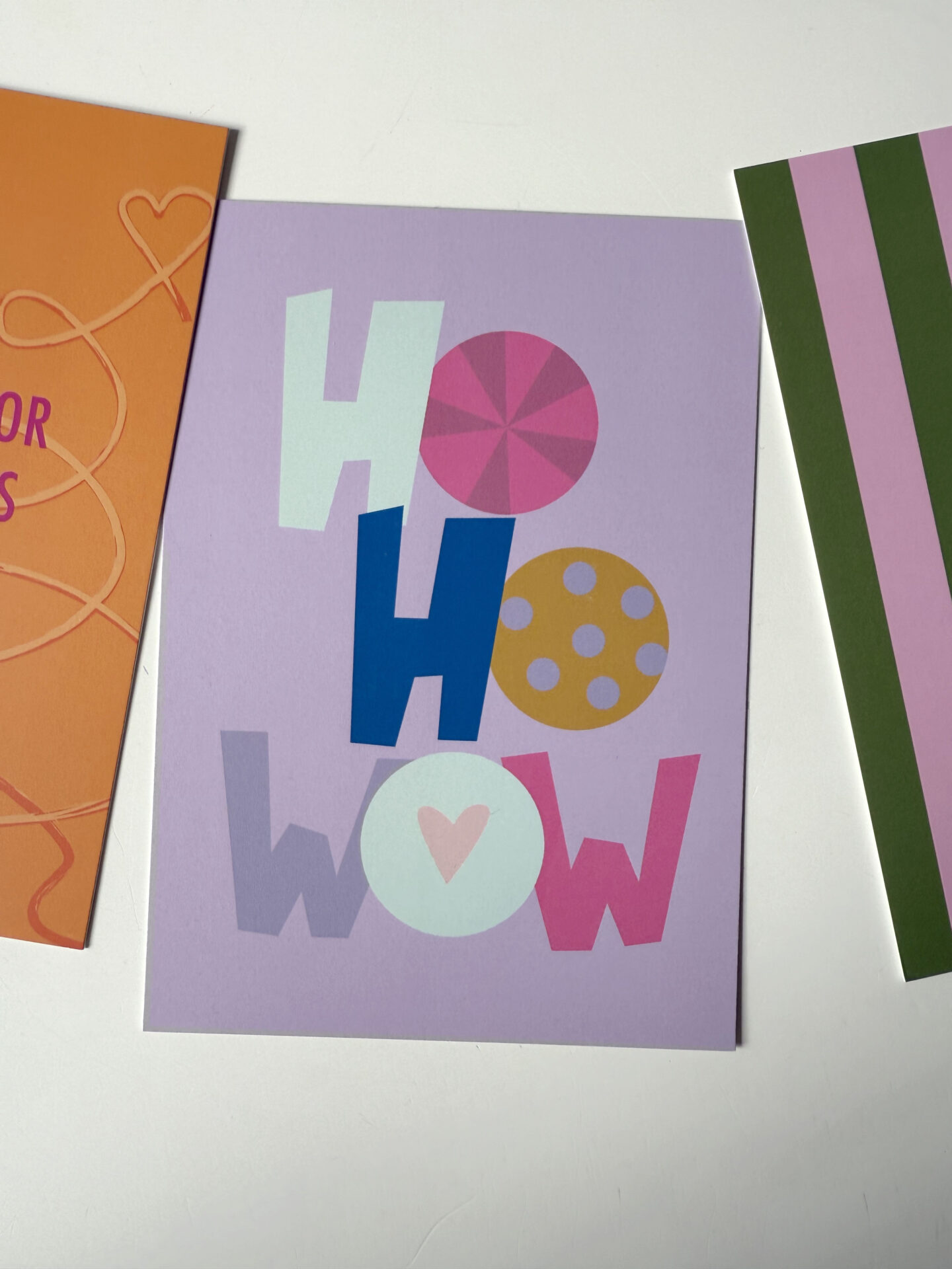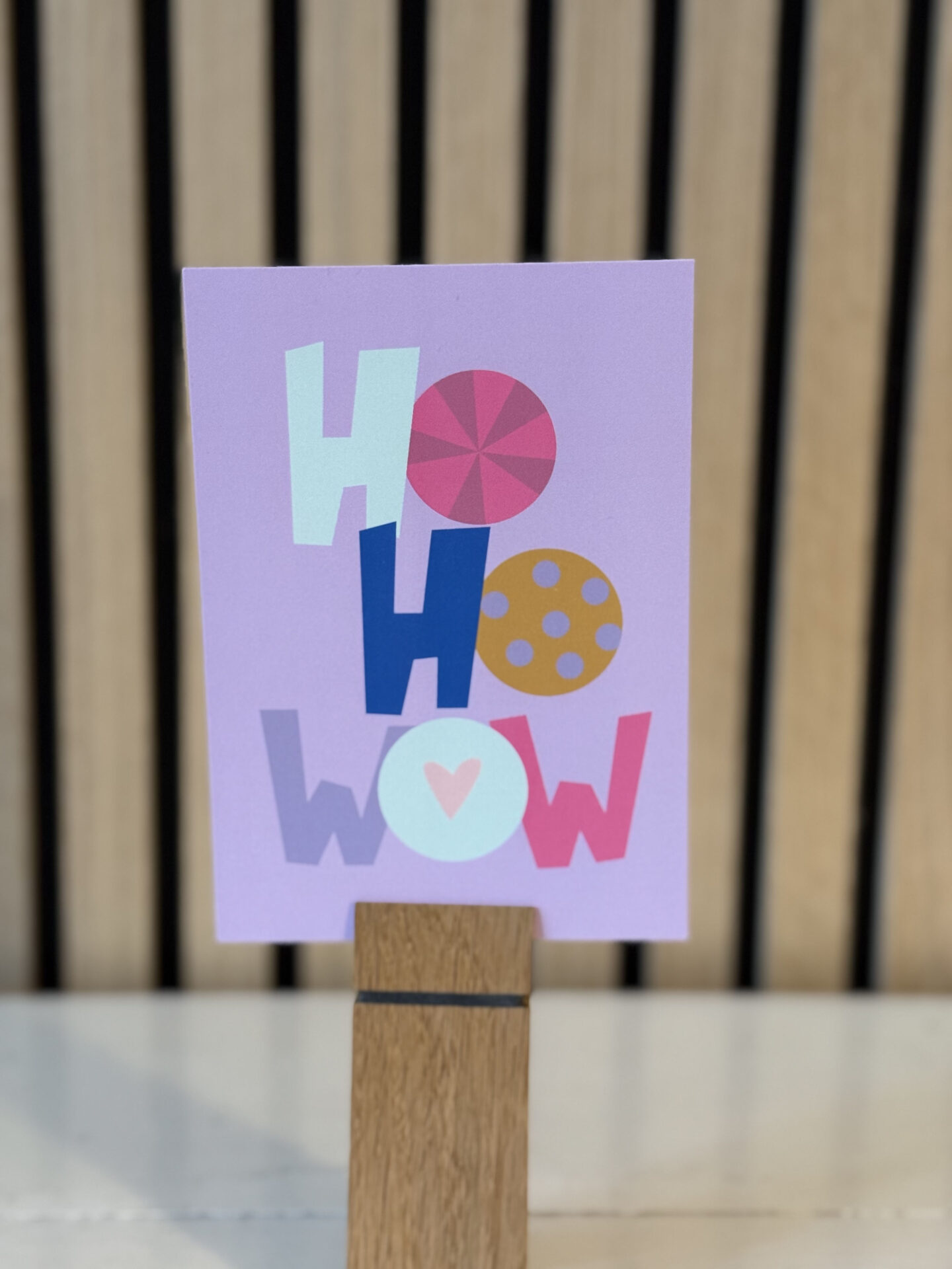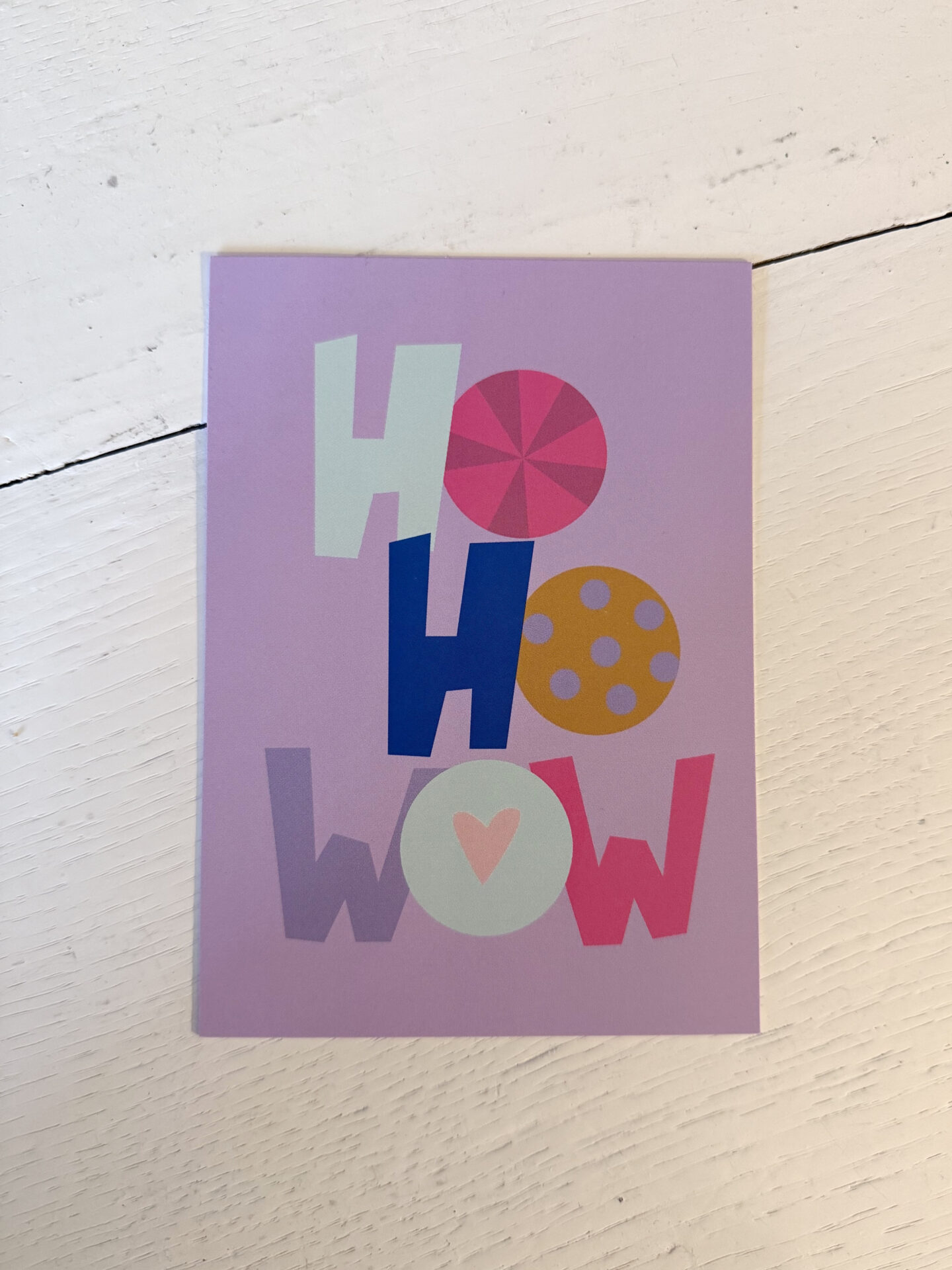 Liebevoll gestaltete Postkarte in Flieder mit der Aufschrift „HO HO WOW“.